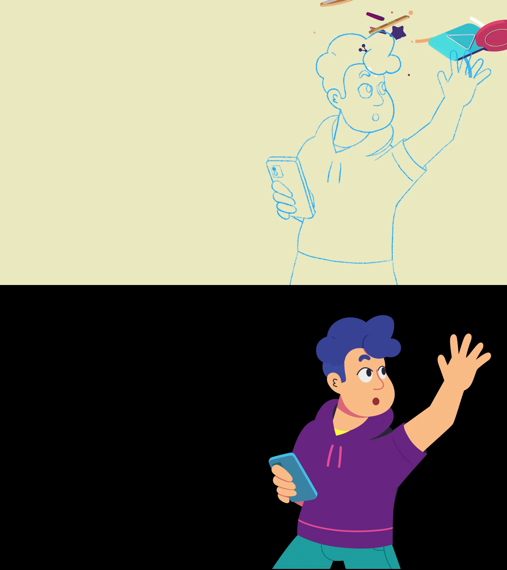 I used a combination of techniques: Cel animation and Cut Out. I elaborated a face and body rig for Alfy and the secondary characters in After Effects, and used frame by frame for aditional shots, such as his entrance and his transition to the space in Toon Boom Harmony.